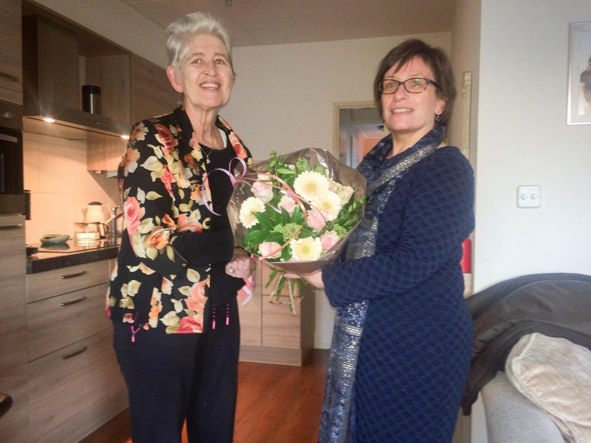 Marijke de Jongste, regiocoördinator van ZOA (rechts op de foto), bedankte Evie onlangs met een mooie bos bloemen voor haar jarenlange betrokkenheid. ‘Ik vind het bijzonder dat zij zich al zo lang inzet voor ZOA. Het treft me dat ze er hart voor heeft en er echt voor gaat.’ aldus Marijke.